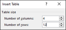 Create a table with 4 columns. The number of rows is determined by the total number of units required plus two. For example, the BSB20120 Certificate II in Workplace Skills qualification will need a 4 x 12 table.