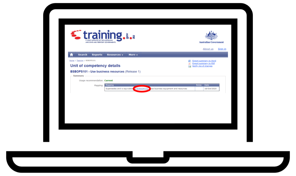Step 2. Click on the link to go to the superseded BSBADM101 Use business equipment and resources unit. You can tell from the BSBADM101 unit code that this is in ‘new format’.
