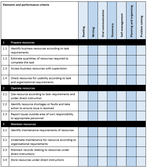 The following is a completed example of a Performance Criteria / Foundation Skills matrix for the BSBOPS101 Use business resources unit. It must be read in conjunction with the Foundation Skills template (see below).