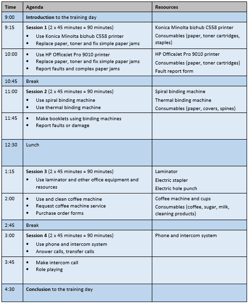 For this example, let us say we are going to allocate on day to deliver training for the BSBOPS101 Use business resources unit. The following is a sample agenda for the training day.