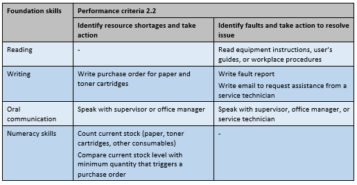 Performance Criteria 2.2 is ‘identify resource shortages or faults and take action to ensure issue is resolved’. The following additional details shows how the Foundation Skills connect with the Performance Criteria when operating a printer. Typical tasks may include: