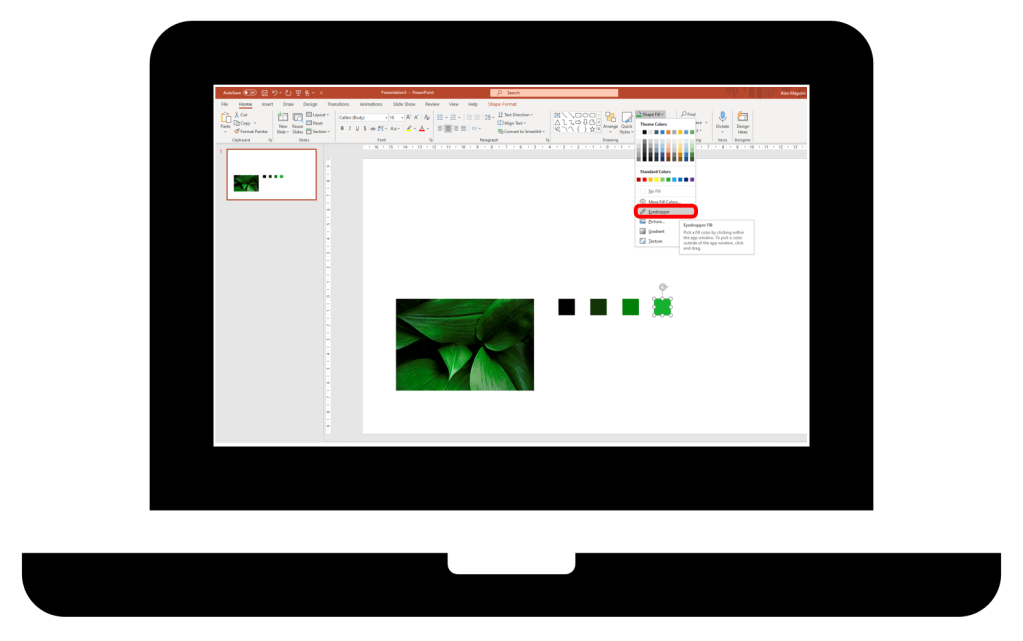 If you are using Microsoft PowerPoint, go to [Home], then select [Shape Fill]. The following example shows how the ‘eyedropper’ tool can be used to create a small selection of greens from the photo of leaves.