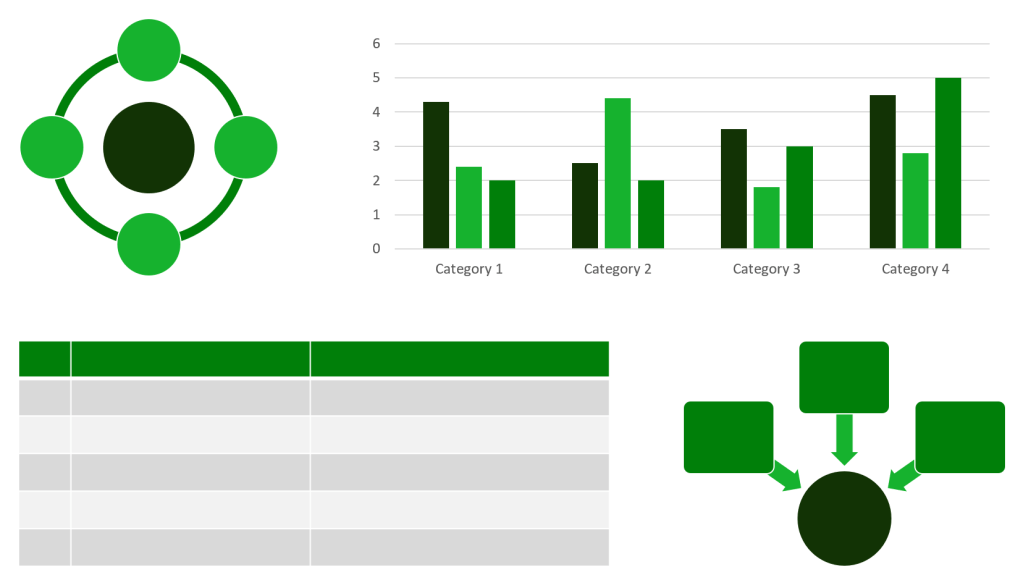 The above greens can then be used for charts, graphs, tables, and diagrams to give a consistent colour theme throughout the document.