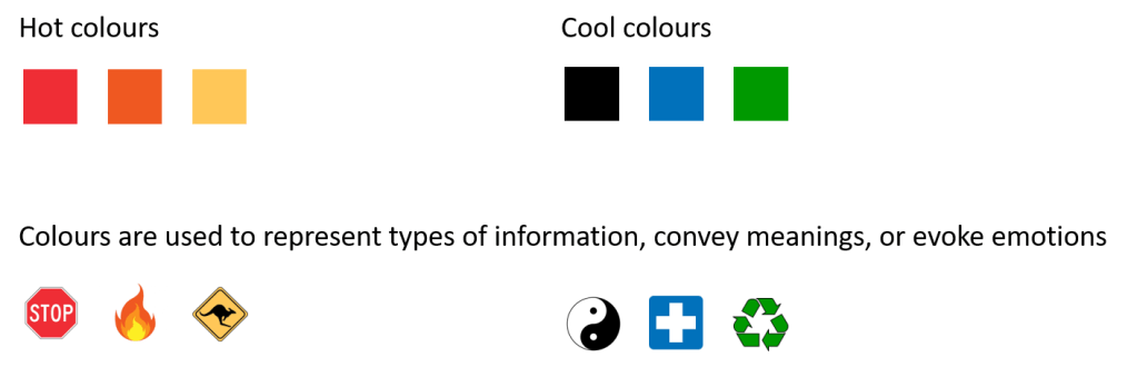 It is common for colours to be used to represent types of information, convey meanings, or evoke emotions. Hot colours may represent energy or action. Cool colours may represent calmness.