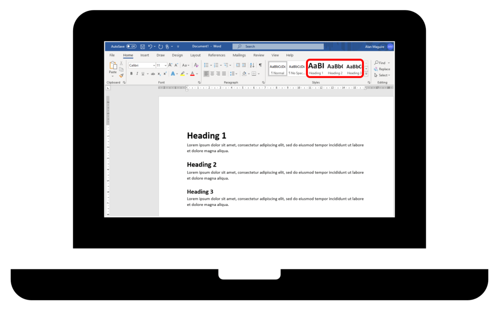 As previously stated, I recommend a maximum of three layers of headings: Heading 1, Heading 2, and Heading 3. For example: