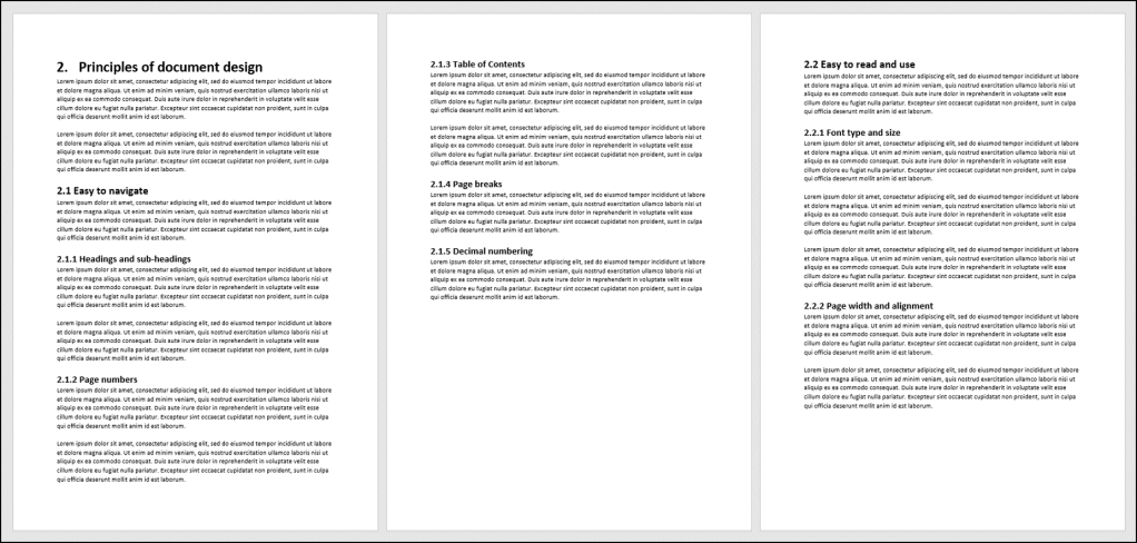 An internet search for ‘principles of document design’ will give you many results. I like the principles of document design described by Ricky Telg. In his introduction to the topic, he says: