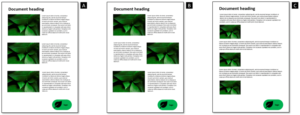 I think [A] looks good for a document to be printed on paper. I think [B] makes the reader work too hard reading from one side to the other, then back again. And I think [C] works best if being read on screen because the text and photos are all left aligned making all elements of the document flow.