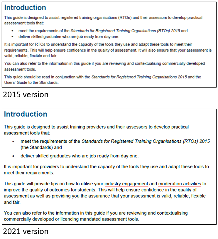 The first difference between the 2015 version and 2012 version of the guide is ASQA’s aim to encourage RTOs to engage industry when developing assessment tools. In the 2015 version, the involvement of industry was on page 4. The 2021 version brings forward a reference to industry to page 1. This update seems to be more symbolic rather than substantive.