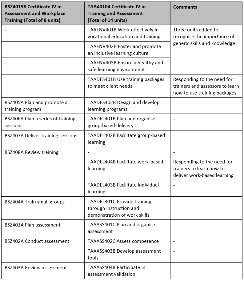 The BSZ40198 qualification was replaced by the TAA40104 Certificate IV in Training and Assessment (released in 2004). The TAA40104 qualification required a total of 14 units. There were 12 core units and 2 units had to be selected as electives. The core units were: