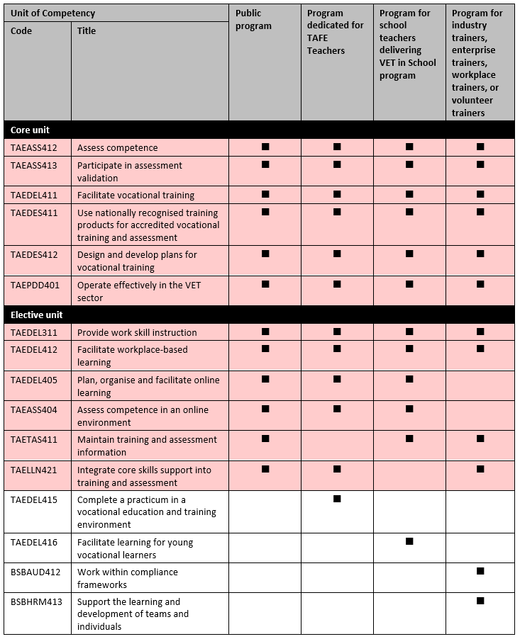 The following shows the units of competency that could be used for a TAE40122 program for industry, enterprise, workplace or volunteer trainers: