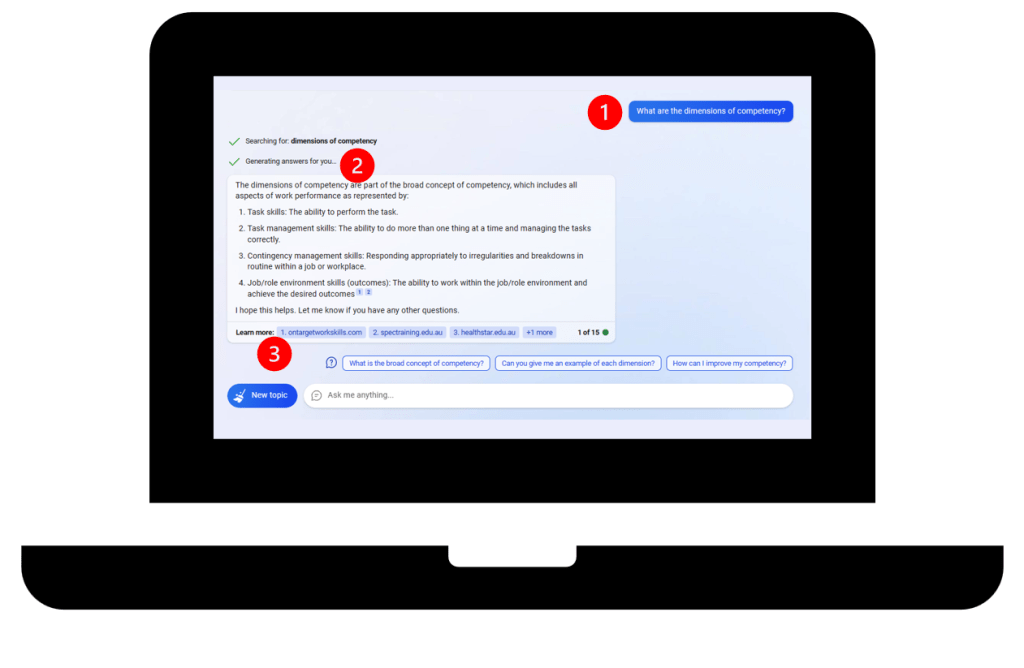 I asked Bing Chat, “What are the dimensions of competency?” Within 15 second I was given the correct answer and it was within the context of the Australian VET system. I hadn’t specified the context but it was exactly what I was wanting.
