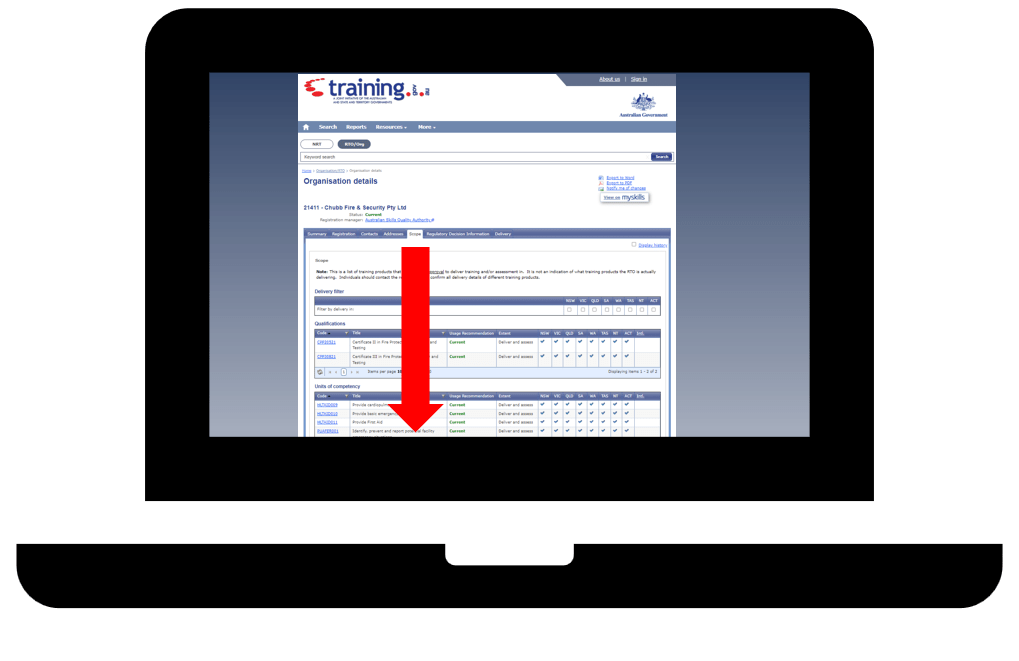 The RTO’s scope of registration will be displayed onscreen. You may need to scroll down to see all the training products that are on the scope of registration.
