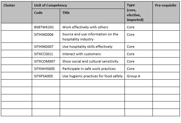 The following table shows how the twelve units of competency for the SIT20322 Certificate II in Hospitality qualification has been clustered and sequenced.