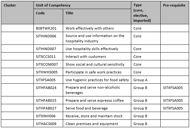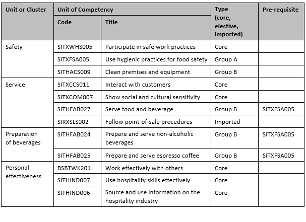 The remaining five elective units have been selected from the Group B list. The choice of electives is determined by the typical tasks performed by workers in a café or coffee shop.
