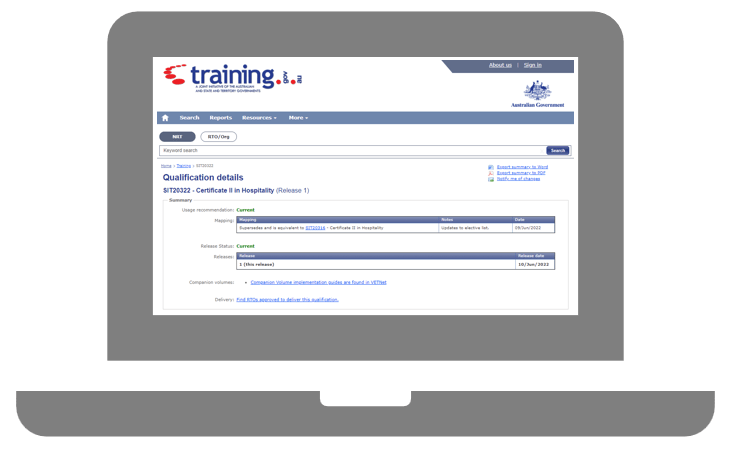 The training.gov.au website provides access to the packaging rule for the qualification. Use the search function to find the qualification details, and scroll down.