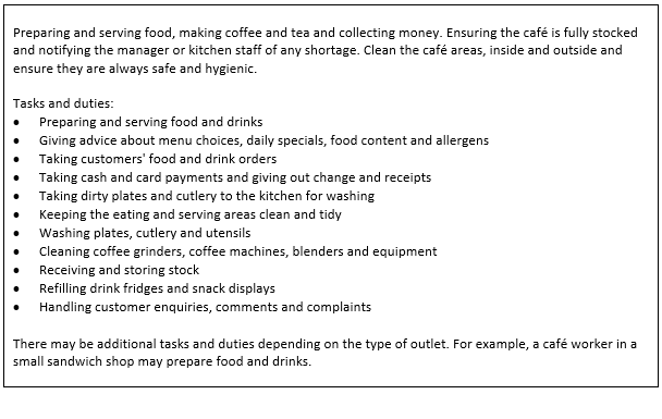 This qualification provides a pathway to work in various hospitality settings, such as restaurants, hotels, motels, catering operations, clubs, pubs, cafés, and coffee shops. For the purposes of this case study, I have focused on a training program for a worker in a café or coffee shop. The following is a brief job description for a café worker.