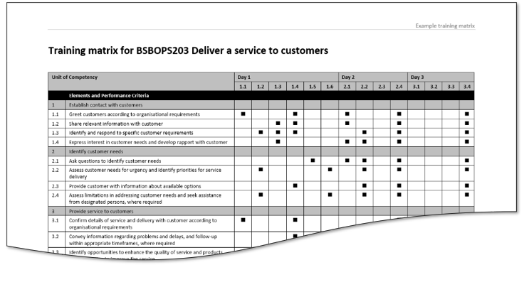 The next example shows the layout for a training matrix covering the BSBOPS203 Deliver a service to customers unit of competency.