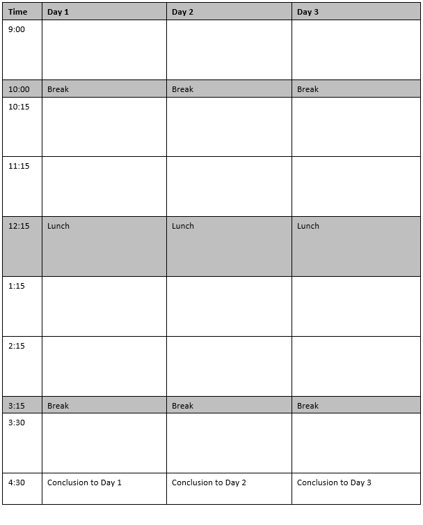 The following shows the outline for a 3-day training program with 6 one-hour blocks of time for each day.