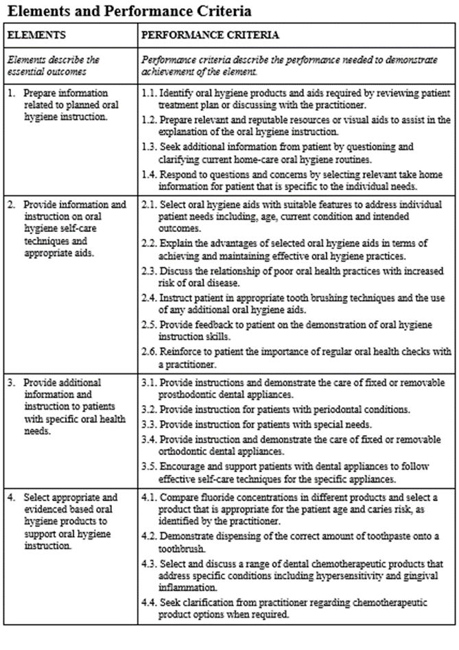 I have been told by a dental assistant that the task of providing oral hygiene instruction to patients take approximately 5 to 15 minutes. Therefore, this may be considered as a ‘small’ unit of competency to perform. However, it would require considerable time and effort by someone to learn the required knowledge that underpins this unit.