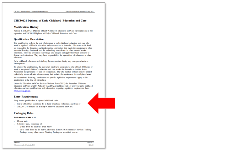 A VET qualification may specify a mandatory entry requirement. For example, entry into the CHC50121 Diploma of Early Childhood Education and Care qualification requires a person to hold the CHC30121 Certificate III in Early Childhood Education and Care qualification or its predecessor.