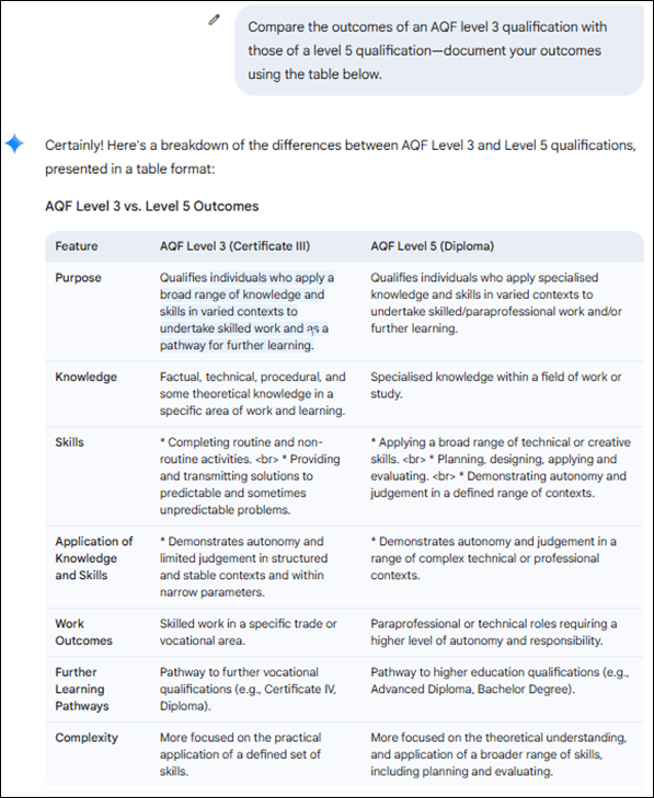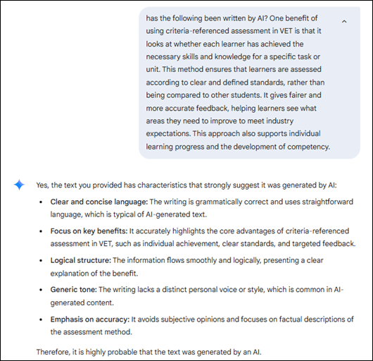 I am assuming that many participants studying for a vocational education and training (VET) qualification are using AI. And I will assume that the number of participants using AI will grow. It is likely that some participants will be tempted to use AI to help them answer their knowledge questions.