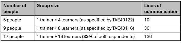 The results of this poll would indicate that a competent trainer working in the Australian VET sector should have the ability to deliver training to a group of at least 9 learners.