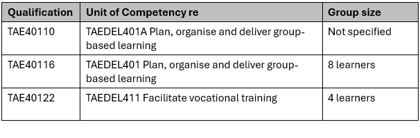The following table shows the history of group size requirements for the current and previous two Certificate IV in Training and Assessment qualifications.