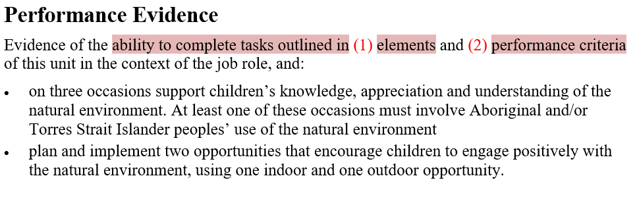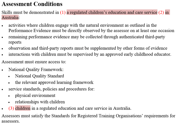 In the following example, the Assessment Conditions states that the performance specified by the unit of competency must occur in a workplace. The workplace must be a regulated children’s education and care service, and it must be in Australia. Also, it should be noted that there must be children involved.