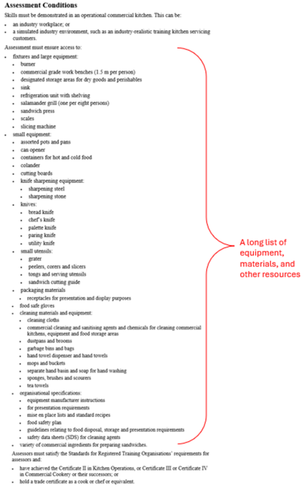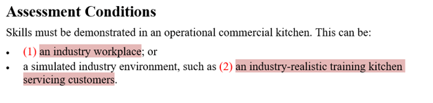 In the following example, the Assessment Conditions permit the performance specified by the unit of competency to occur in a workplace or simulated workplace. It should be noted that the simulated workplace needs to be an industry-realistic kitchen, and it must be serving customers.