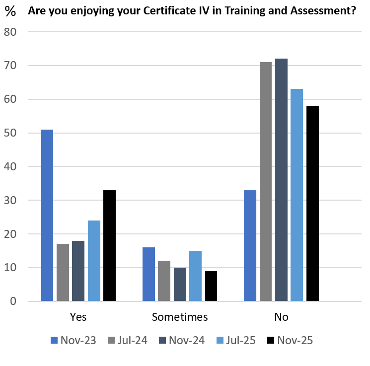 The result from November 2023 shows that 50% of people studying for their Certificate IV in Training and Assessment were enjoying it and 50% were not enjoying it, or only sometimes enjoying it. This is when most people were doing the TAE40116 qualification.