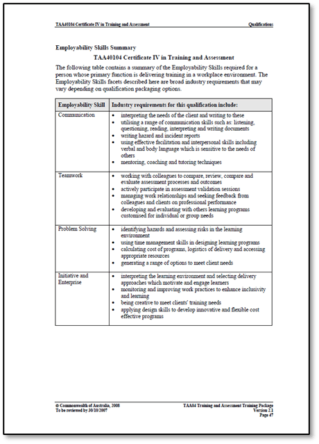 The following two pages is an example of Employability Skills being described for the TAA40104 Certificate IV in Training and Assessment qualification (initially released in 2004).