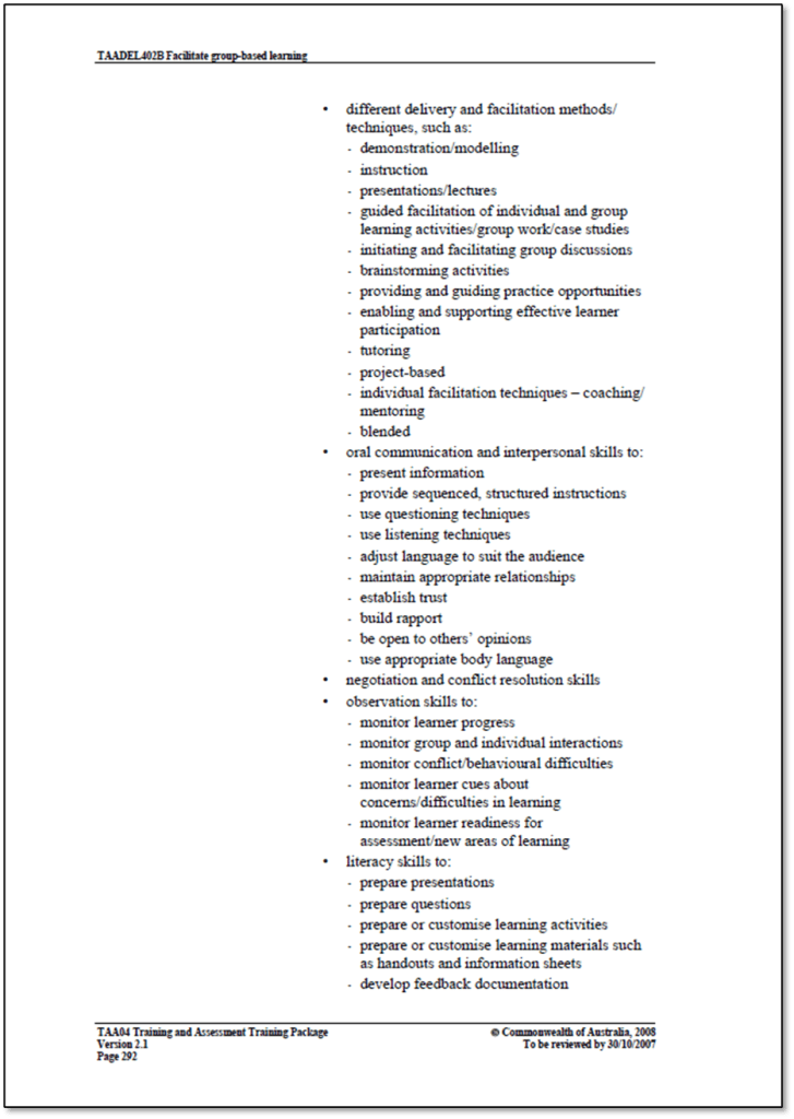 The following 3 pages is an example of how Employability Skills were explicitly embedded in the TAEDEL402B Facilitate group-based learning unit of competency (initially released in 2004).