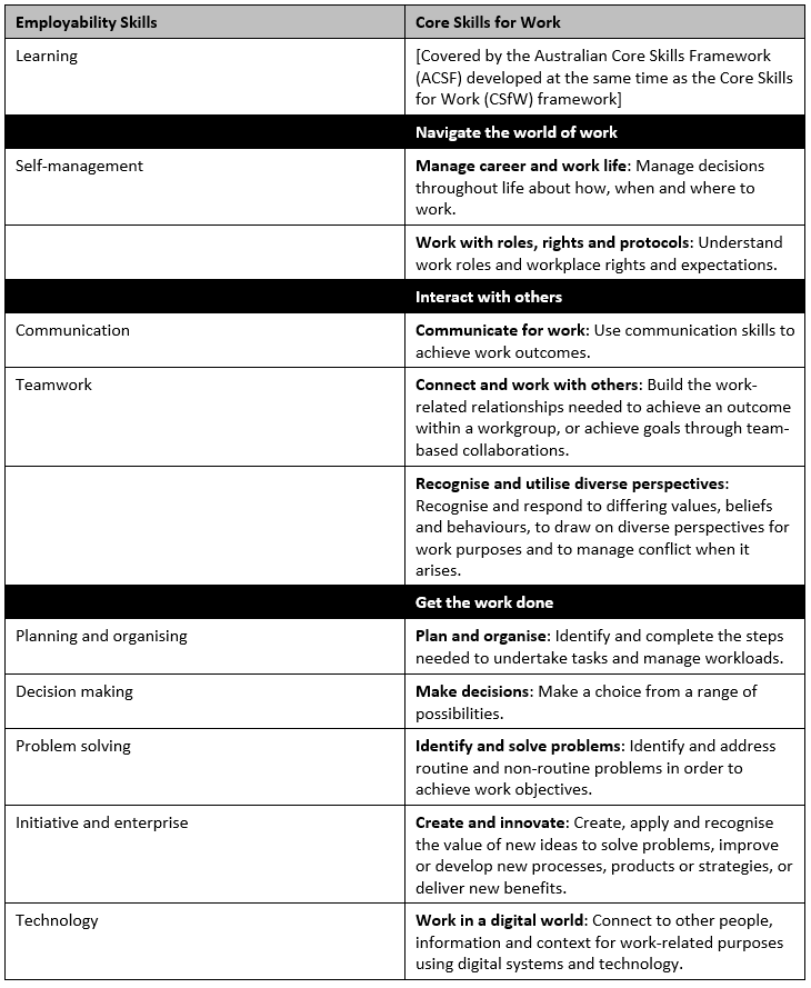 The Cores Skills for Work were developed to replace the Employability Skills. The following table compares the Employability Skills with the Cores Skills for Work.