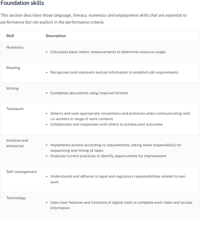 Note: Not every Training Package developer has described Foundation Skills in the same way. And some Training Package have limited or no details about Foundation Skills.