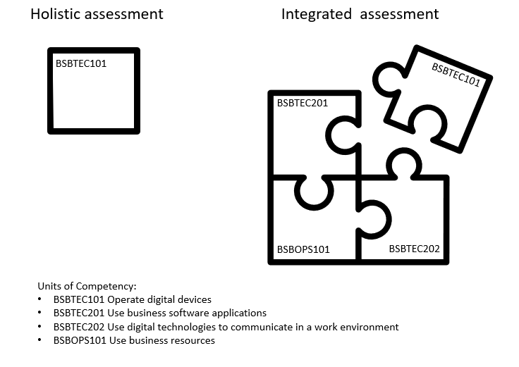 Holistic assessment focuses on one unit of competency, and integrated assessment focuses on multiple units of competency. The following illustrates the difference between an holistic and integrated approach to assessment.